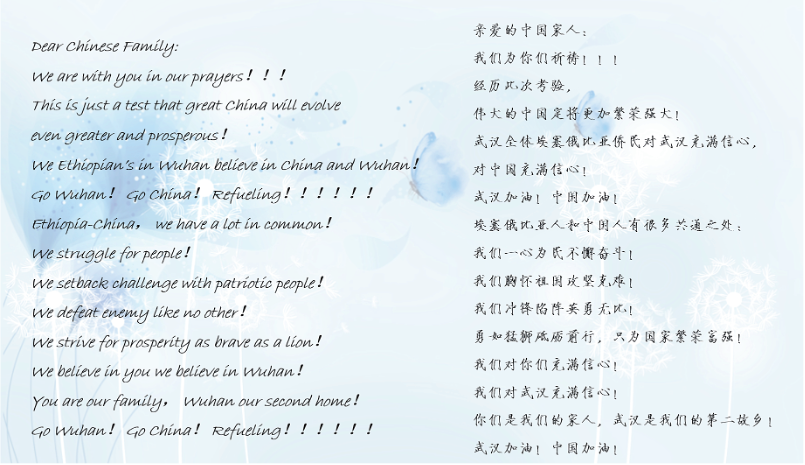 在武漢的埃塞俄比亞學生發出的慰問信