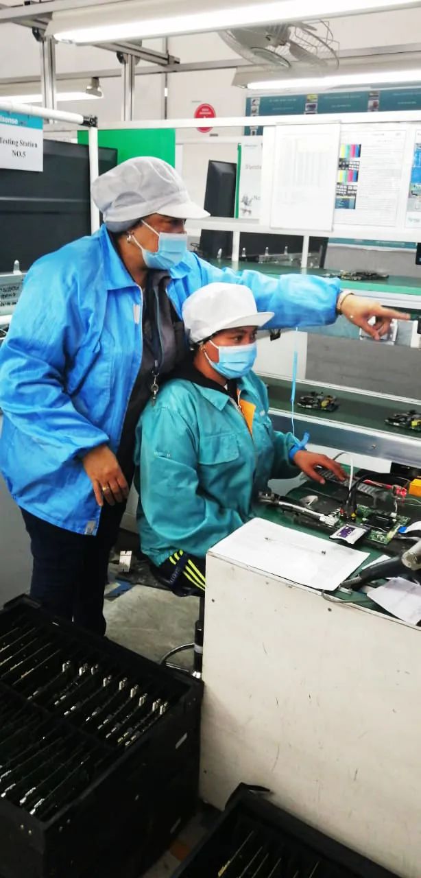 培訓第一天,大家發現,大部分員工都是本地人,講的也是阿菲利加語(南非當地語言)。來自中國的技術工程師身體力行,親自演示每個零件的組裝方法,一對一指導。由于工序眾多,工程師們經常在培訓結束后,利用休息時間開小灶,一遍遍重復組裝流程;還把重點難點編成操作指南發給大家。在工程師們的悉心指導下,茱莉斯逐漸掌握了線體合成工作的技巧,并迅速成為技術骨干,還能指導其他同事完成零件組裝工作。